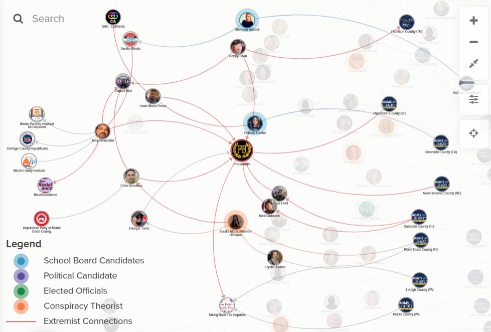 At least nine county chapters of Moms for Liberty have connections or associations with the far right violent extremists street gang the Proud Boys.